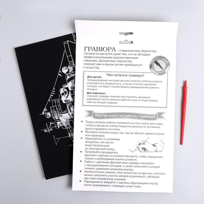 Гравюра представляет собой многослойное панно, покрытое чёрной краской, на которое нанесён контур рисунка. С помощью особого скребка (штихеля), который входит в набор, путём процарапывания и создается гравюра. Новая серия с уникальным дизайном порадует вас разнообразием рисунков.