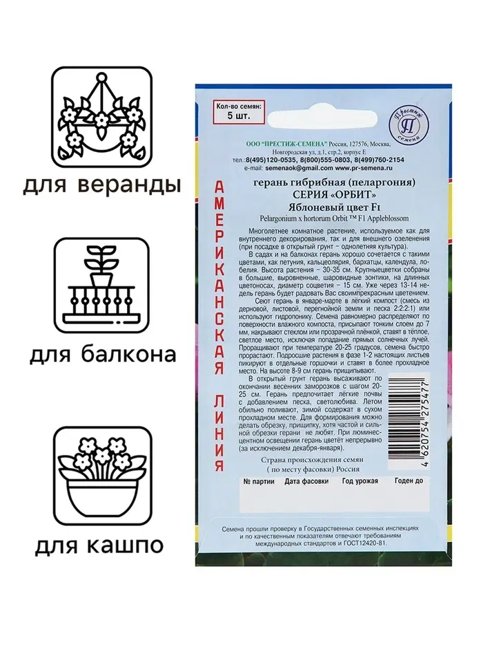 Семена комнатных цветов Герань «Яблоневый цвет», F1, 5 шт., розовая, «Престиж семена»