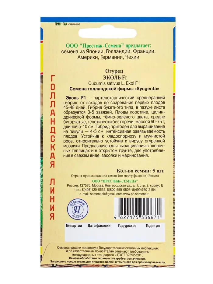 Семена Огурец «Эколь» F1, раннеспелый, партенокарпический, 5 шт., «Престиж семена»