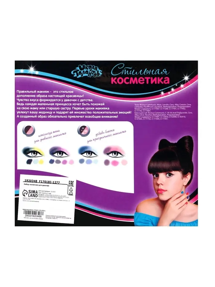 Детская косметика «Школа талантов» позволит ребёнку экспериментировать со стилем. Набор теней поможет девочке подобрать оптимальные варианты для вечерних и дневных образов. Косметика без труда смывается водой или с помощью ватного диска и безопасна для детской кожи.