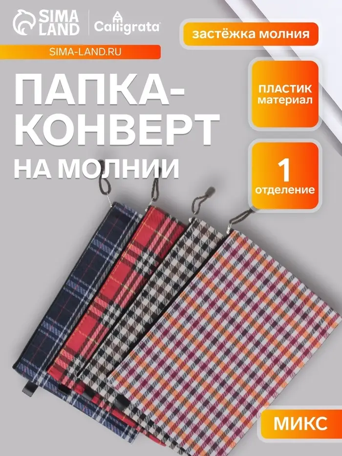 Папка-конверт на молнии Calligrata «Шотландка» А4, МИКС