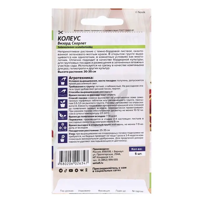Семена комнатных цветов Колеус «Визард Скарлет», 5 шт., «Семена Алтая»