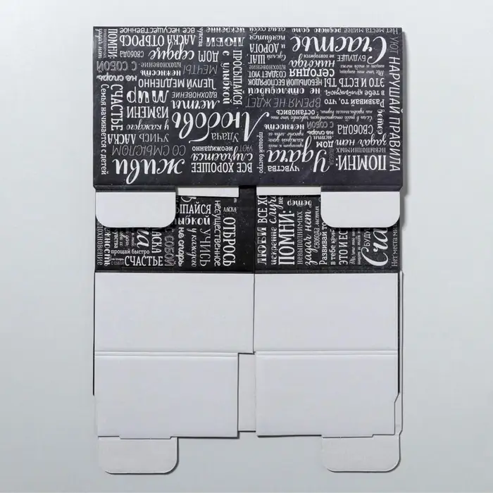 При сборке коробки необходимо тщательно прогибать все биговки (линии сгиба), чтобы крепления плотно вошли в пазы.