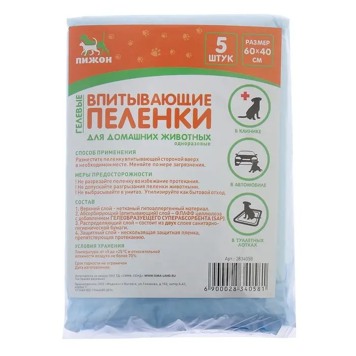 Впитывающие пелёнки для животных «ПИЖОН», 60×40 см, гелевые, набор 5 шт.