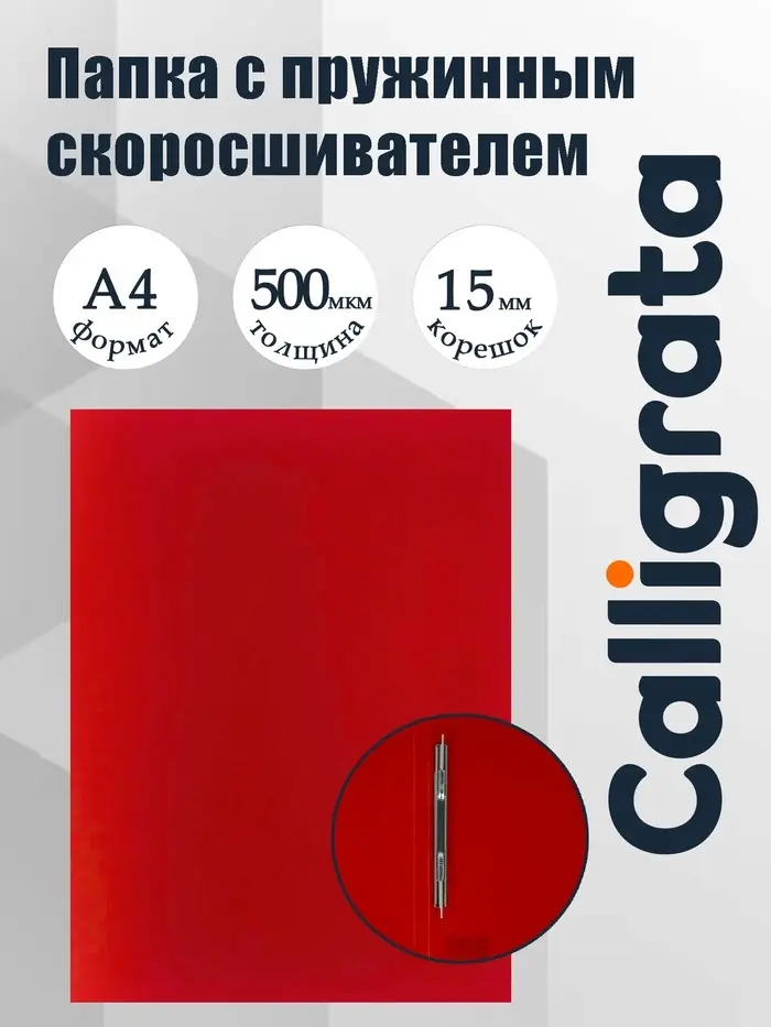 Папка с пружинным скоросшивателем Calligrata предназначена для сшивания и хранения бумаг формата А4. Цвет папки – красный. Папка изготовлена из качественного полипропилена плотностью 500 мкм с текстурой «песок». Тип скрепления – пружинный скоросшиватель. Размер изделия составляет 230 х 305 мм. Ширина корешка – 15 мм позволяет вмещать в папку до 100 листов