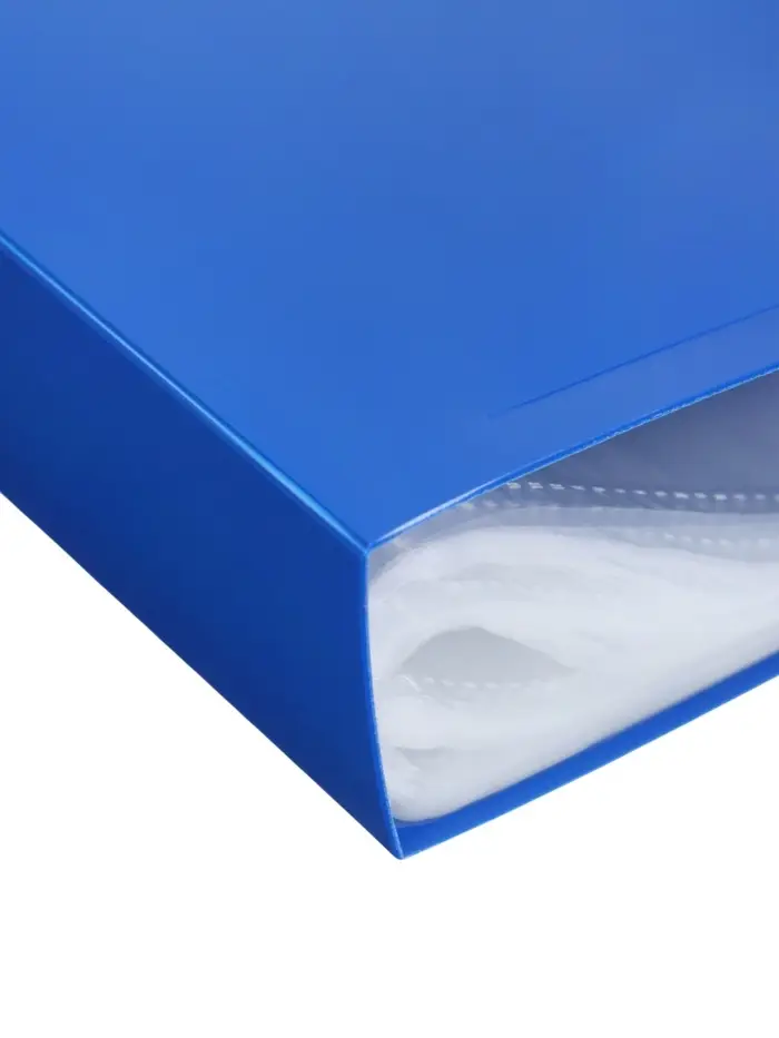 Папка с 100 вкладышами Calligrata – отличный помощник для хранения бумаг формата А4. Внешняя сторона папки дополнена стандартной фактурой «песок», сохраняющим внешний вид изделия от загрязнений и повреждений. Размер изделия составляет 310 х 235 мм. Ширина корешка – 40 мм. Тип скрепления – термосварка. Бумага, вложенная в папку, не требуется перфорация дыроколом. На корешке папки есть удобный карман