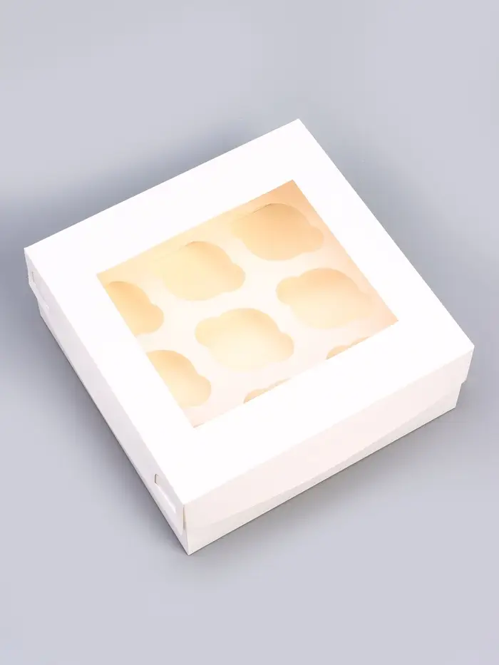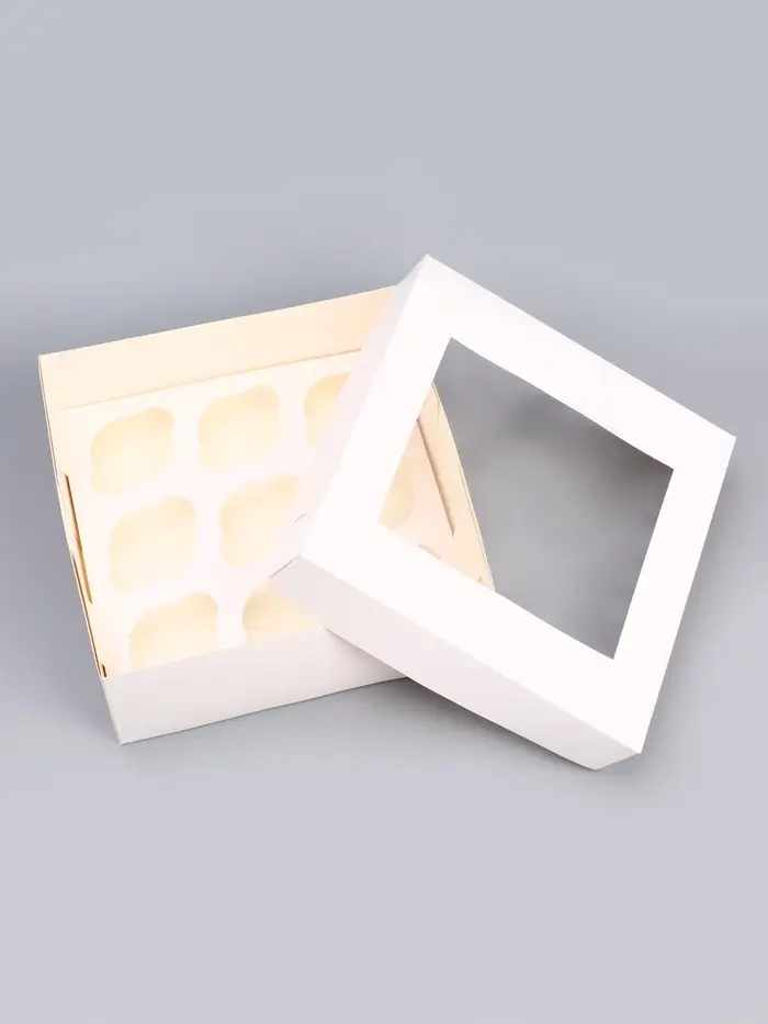 Большая белая коробка для 9 капкейков с окном — это профессиональная упаковка для солидной партии десертов. Её лаконичный дизайн и прозрачная крышка создают эффект витрины, идеально подходящей для продажи, подарка или праздничного стола.