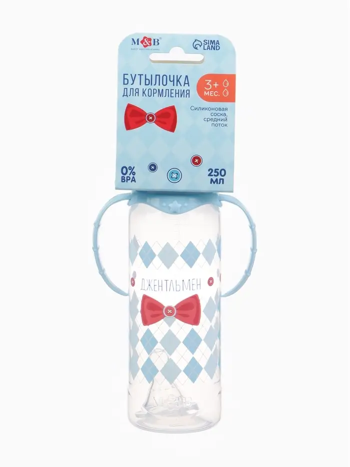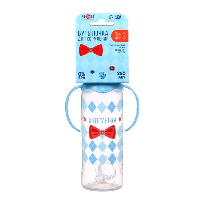 Бутылочка для кормления малыша M&B «Маленький джентльмен», классическое горло, с ручками, от 3 мес., 250 мл., голубой