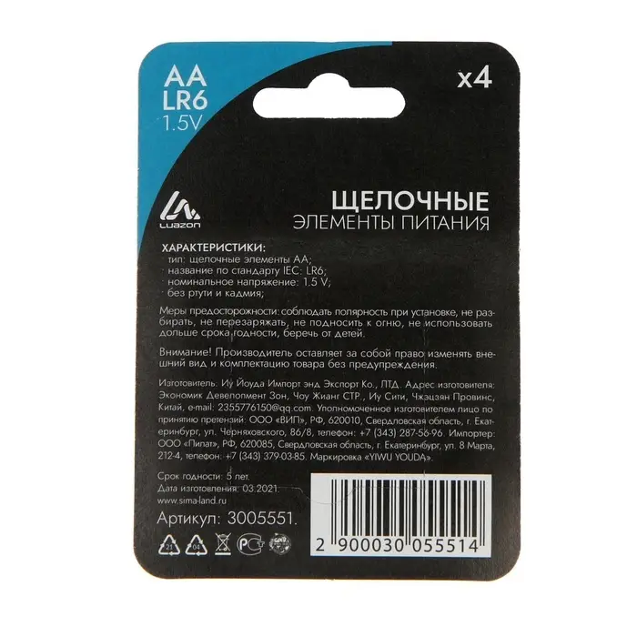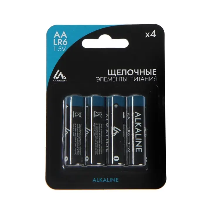 Батарейка алкалиновая (щелочная) Luazon, АА, LR6, блистер, 4 штуки