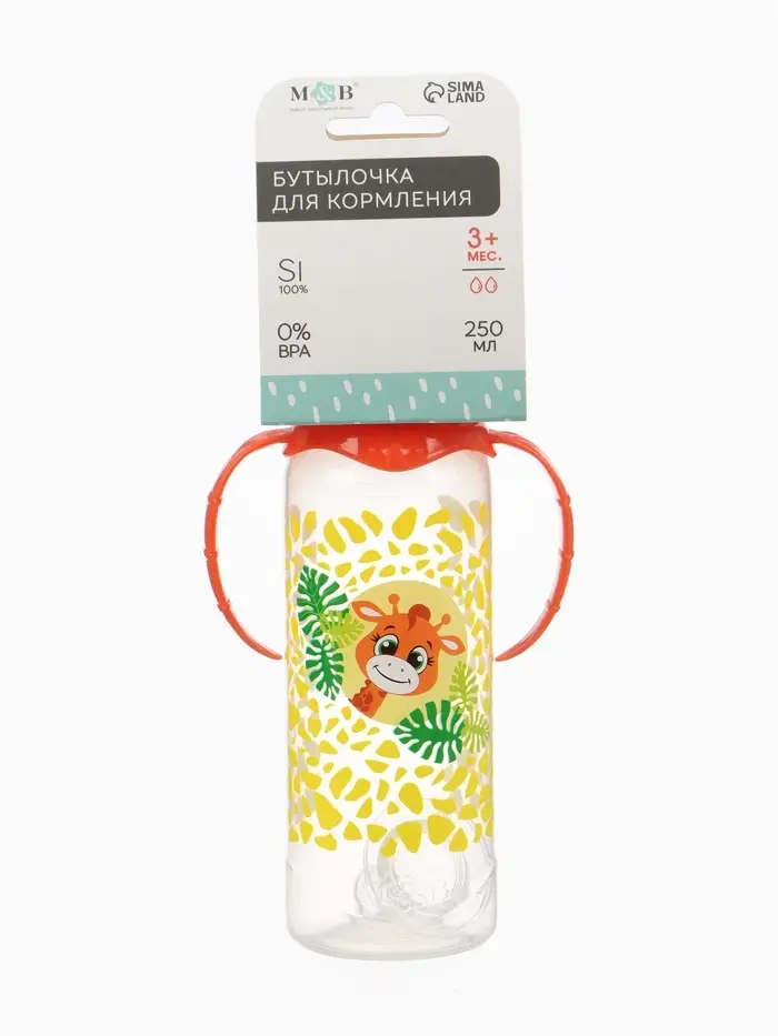 Бутылочка для кормления малыша M&B «Жирафик Лило», классическое горло, с ручками, от 0 мес., 250 мл., оранжевая