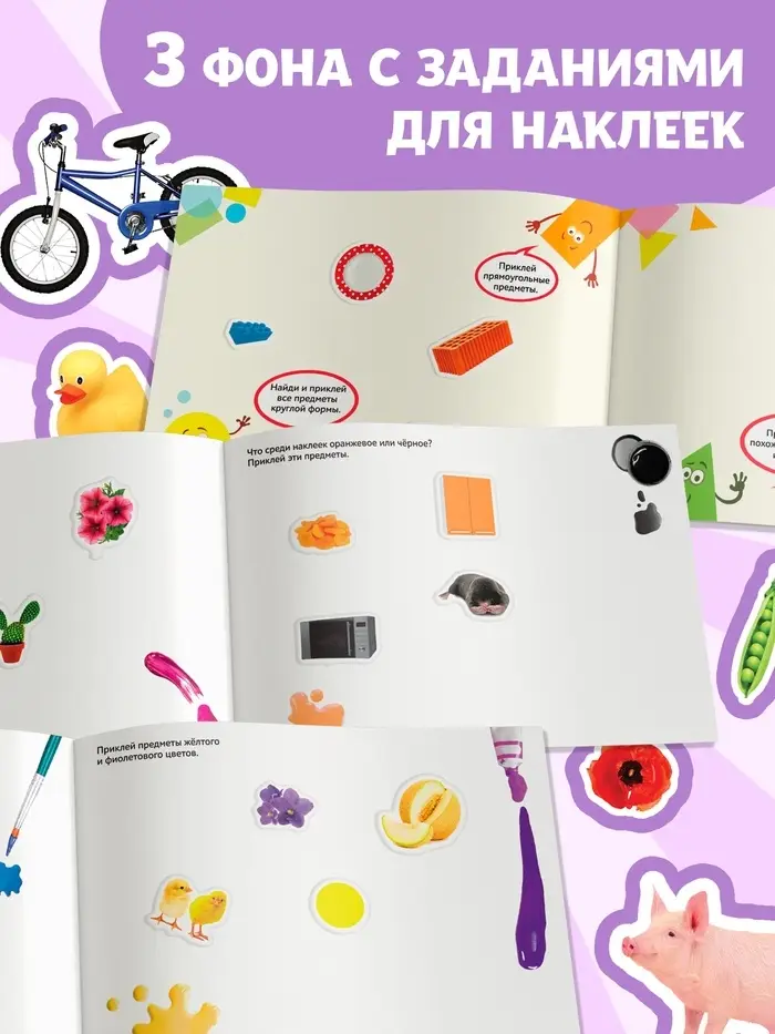 На каждой странице есть задания, в которых необходимо приклеить картинки с соответствующими персонажами и предметами или их определённое количество. Упражнения положительно влияют на развитие мелкой моторики, внимания, речи и расширение кругозора.