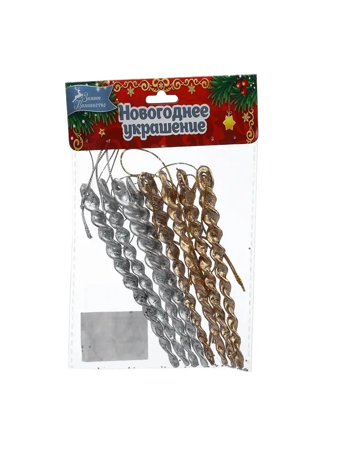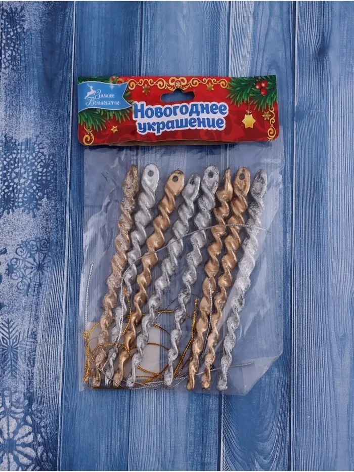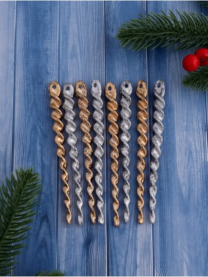 Создайте праздничный ансамбль в стиле ар-деко и барокко — 8 резных сосулек золотого и серебристого оттенков! Пластиковые сосульки для ёлки с витым дизайном — это соединение советской ностальгии и современного фьюжна. Игрушки с перфорированной текстурой и металлическим блеском станут универсальным решением для зимнего декора, где важны контраст и торжественность.