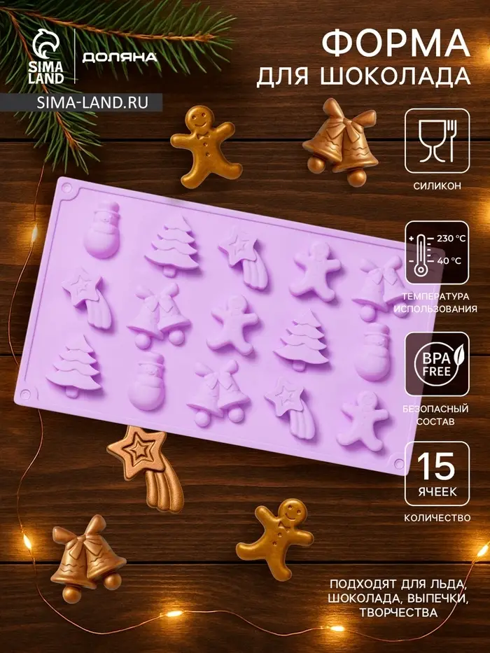 Форма для конфет и шоколада новогодняя Доляна «Ёлочки - иголочки», силикон, 30×17.3×1.3 см, 15 ячеек, сиреневая