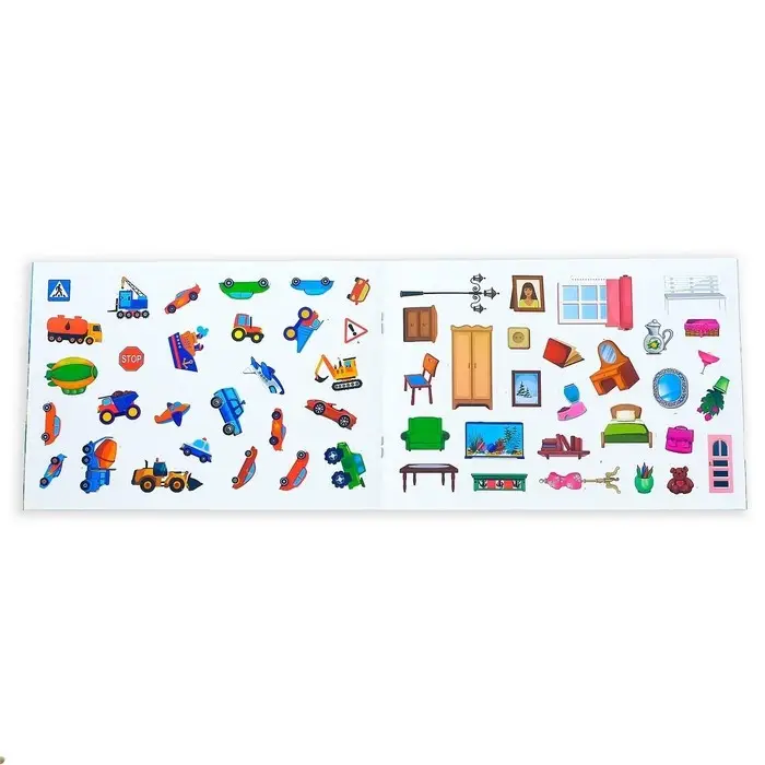 - 111 наклеек с изображениями машин, дорожных знаков, мебели и других предметов.