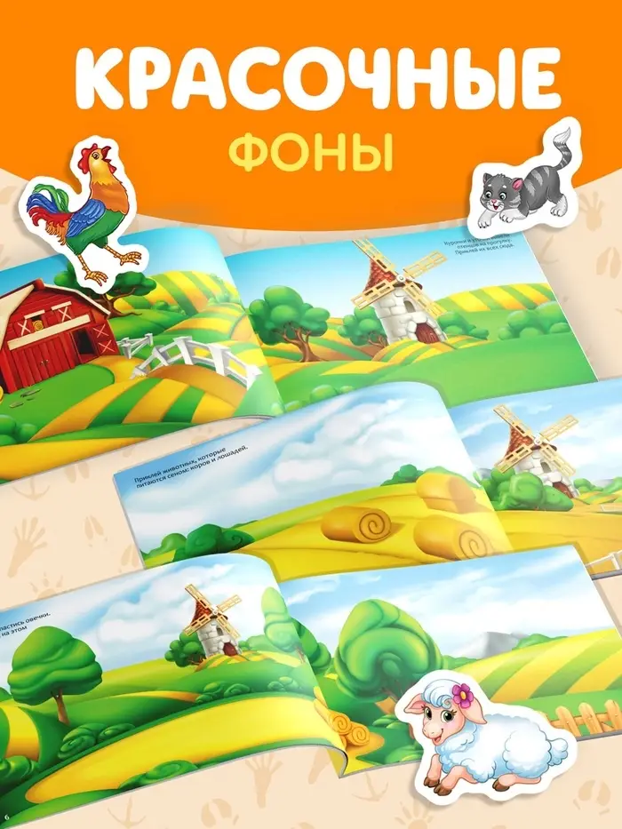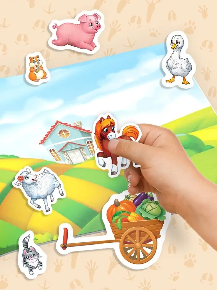 Поиск подходящего места в книге и взаимодействие с наклейками развивает координацию движений, мелкую моторику рук, пространственное и логическое мышление, а также расширяет кругозор.