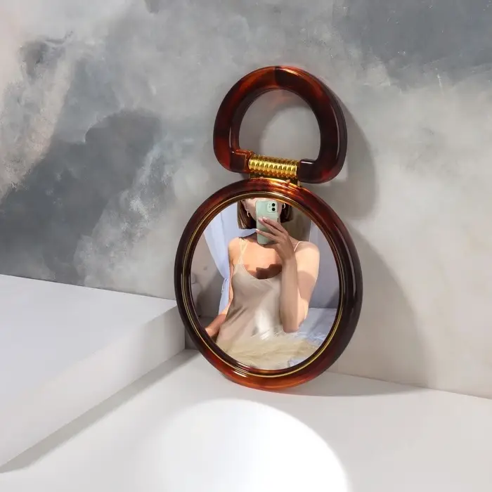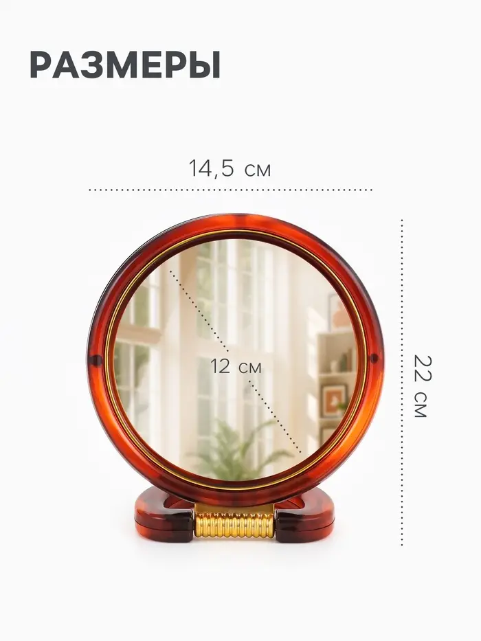 Двустороннее настольное зеркало с увеличением и янтарной рамой сочетает практичность и стиль в компактном формате. Круглая зеркальная поверхность диаметром 12 см обеспечивает детальный обзор, а поворотный механизм позволяет легко менять угол наклона для удобного использования в детской или спальне.