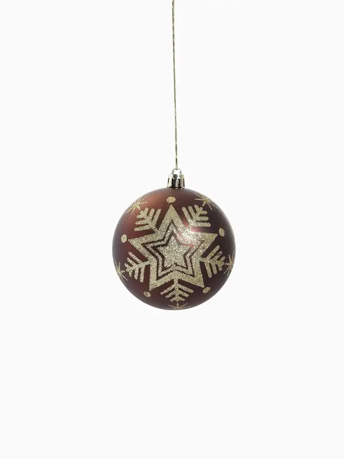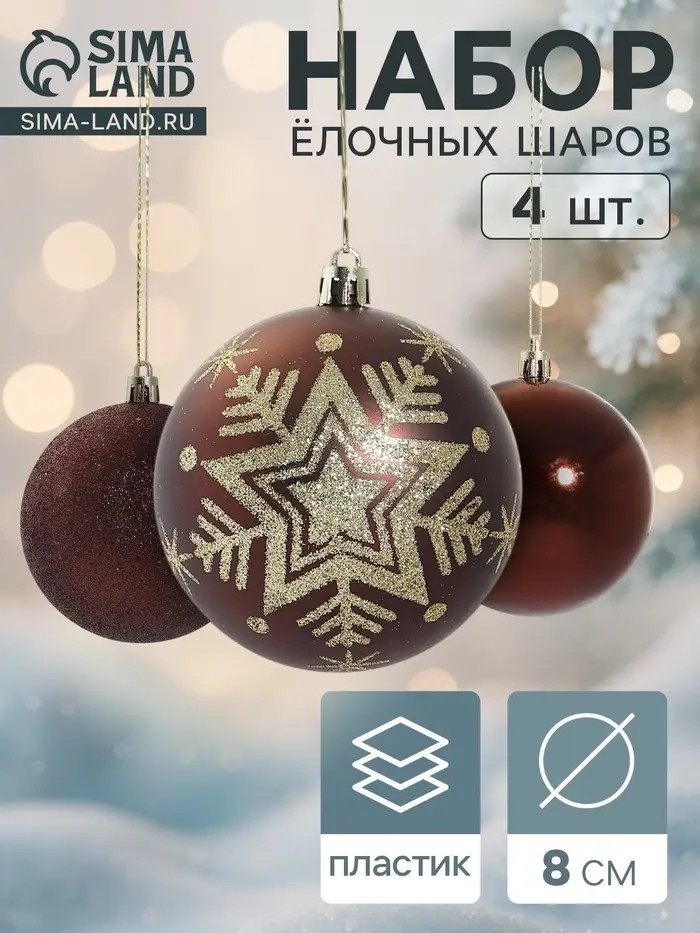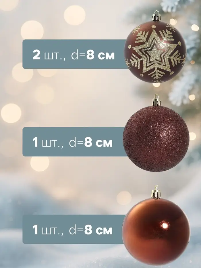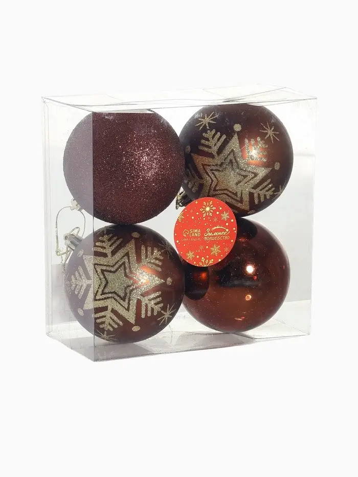 Ёлочные игрушки «Шары со снежинками» коричневые с рисунком — это доброжелательный и образной акцент для новогоднего декора. Пластиковые шары с зимним принтом подходят для ёлки, подарков или окон — элемент убранства в стиле советской эстетики для тех, кто ценит форму, свет и атмосферу чуда без вычесленности и лишних деталей.