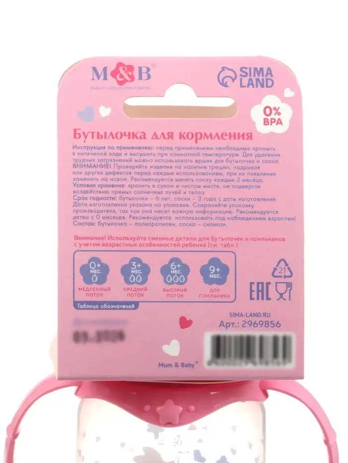 Бутылочка для кормления M&B, широкое горло, медленный поток, от 0 мес., 270 мл.