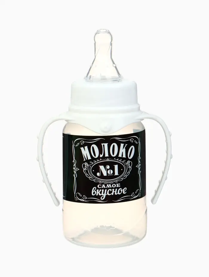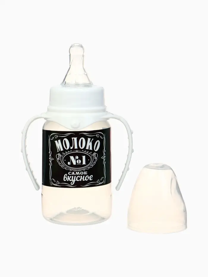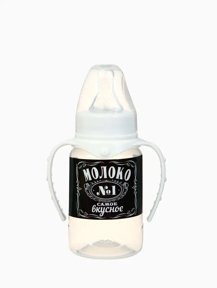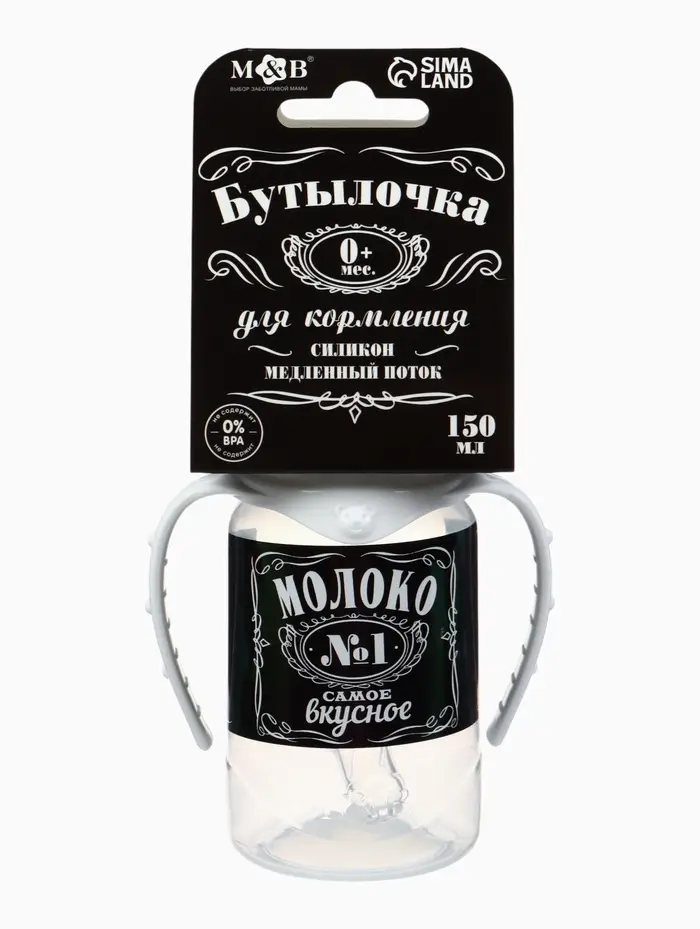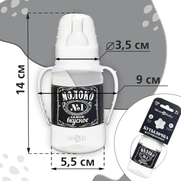Бутылочка для кормления M&B «Люблю молоко», классическое горло, с ручками, от 0 мес., 150 мл., чёрный