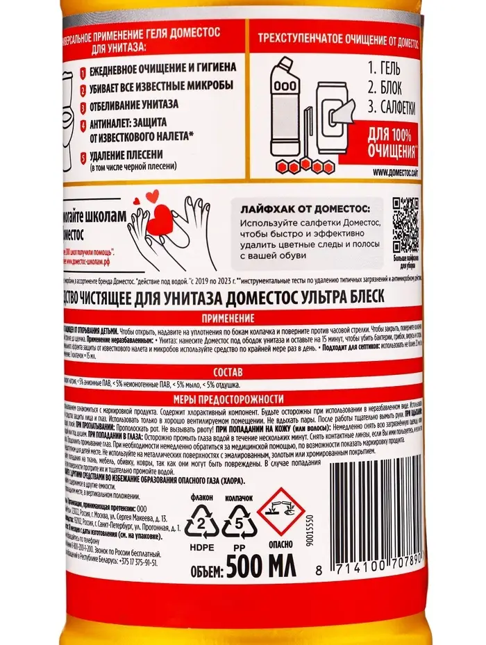 Универсальный чистящий гель Domestos "Ультра блеск" оснащен специальном колпачком от открывания детьми. Чтобы открыть, надавите на уплотнения по бокам колпачка и поверните против часовой стрелки. Чтобы закрыть, поверните колпачок по часовой стрелке до щелчка.