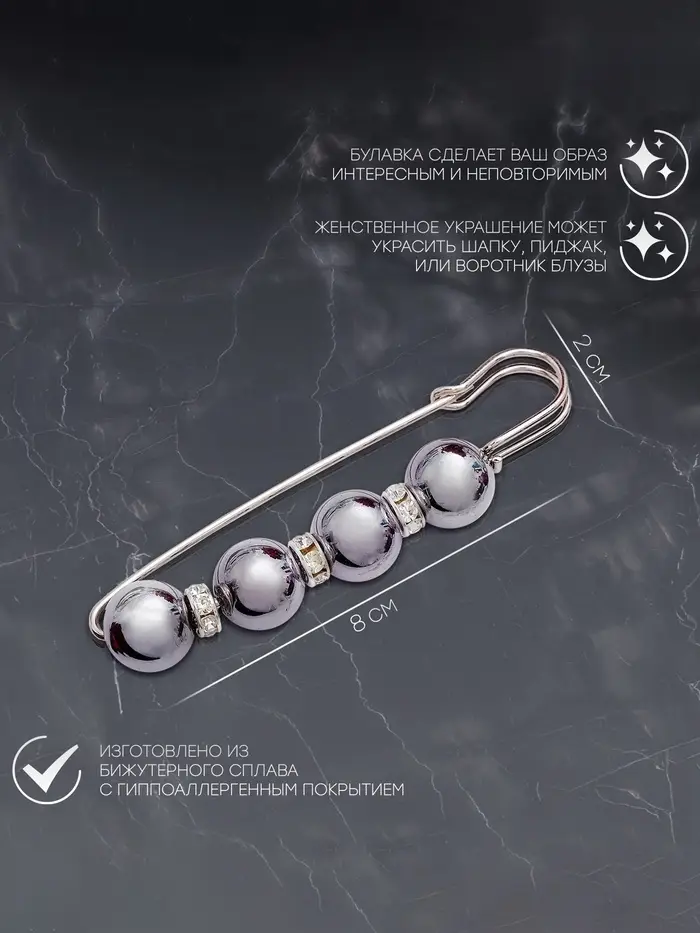 Данная булавка – настоящая находка для модниц, предпочитающих нетривиальные аксессуары. Брошь-булавка станет не только оригинальным дополнением вашего наряда, но и позволит без труда приколоть при необходимости палантин или шейный платок. Используйте её в качестве украшения шляпки, рубашки или галстука. Булавка «Квартет» шар №12, 8 см, глянцевая, серая в серебре внесёт особую нотку изящности в ваш образ.