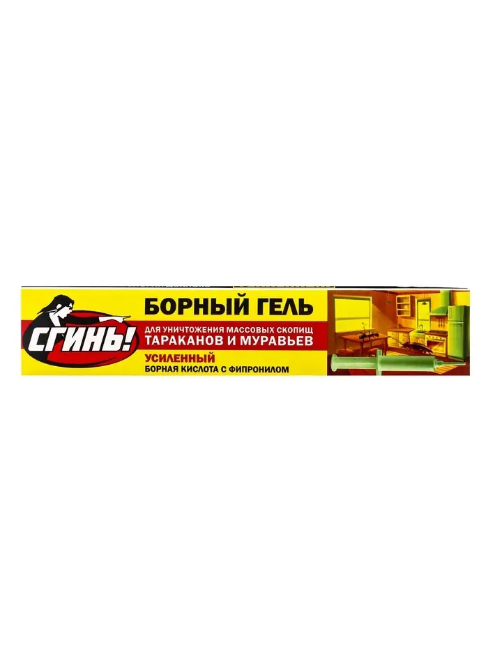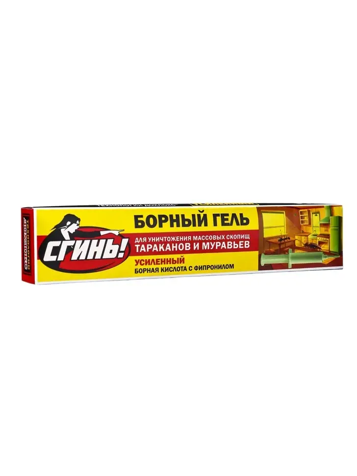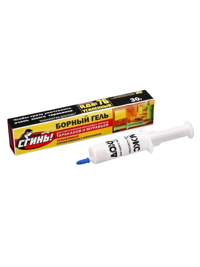 В состав геля входит борная кислота и фирменная пищевая приманка с ядом Дохлокс №76. По сравнению с другими гелями Дохлокс, эффективность этого геля еще более высокаяБорный гель следует выдавливать каплями и наносить по периметру помещений, а так же около вентиляционных и канализационных отверстий, мусоропровода, за батареями и т.п. Борный гель (усиленный) — это средство первичной ударной обработки для помещений с очень высокой степенью зараженности помещений тараканами.