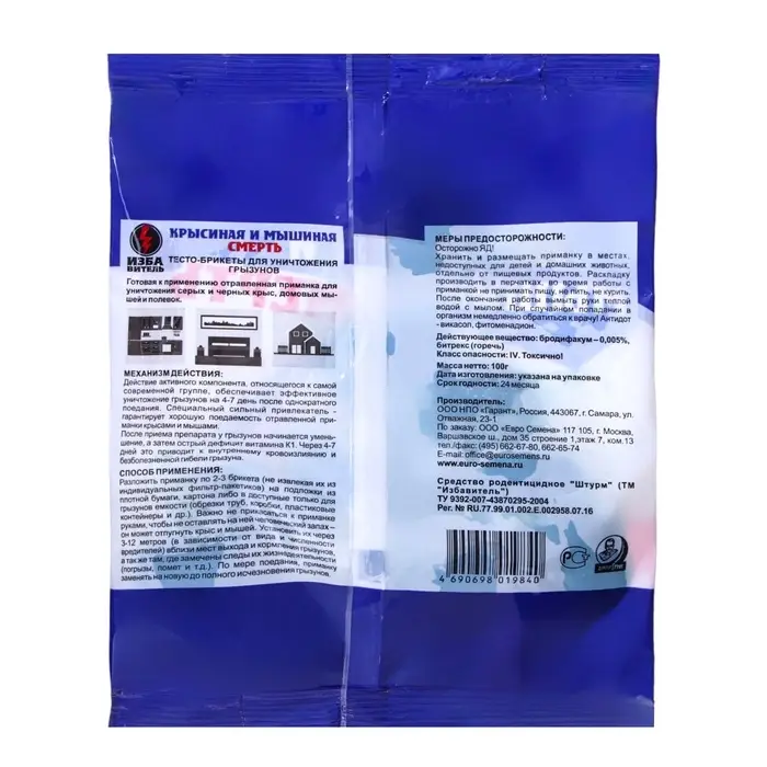 Готовая пищевая отравленная приманка с мумифицирующим эффектом для уничтожения серых и черных крыс, домовых мышей, полевок и других мышевидных грызунов для применения населением в быту.