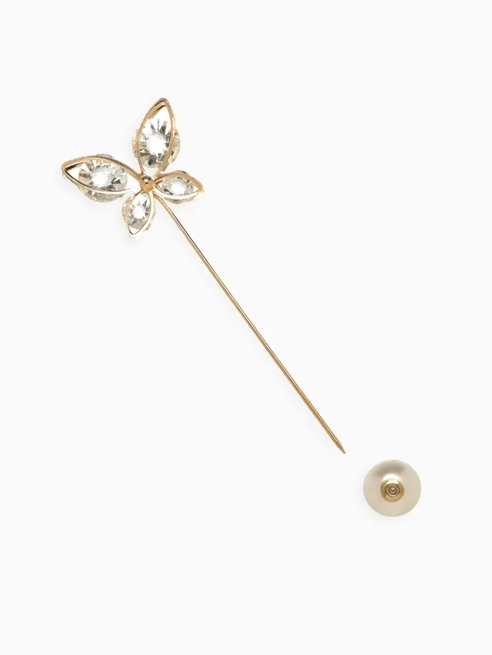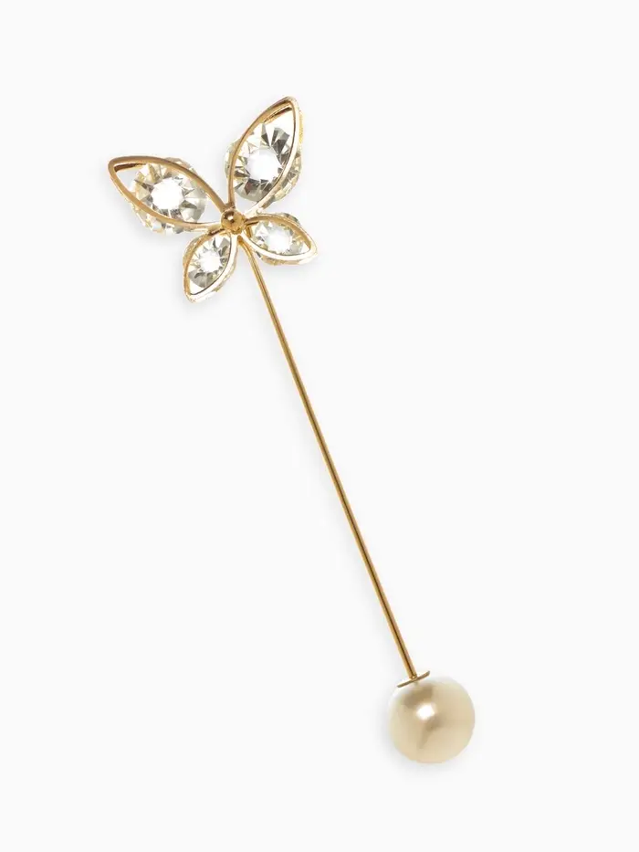 Объёмная брошь в форме бабочки длиной 8,5 см поражает своей изящной белоснежной красотой и утончённым золотым обрамлением. Эффектный аксессуар из металла с вставками из жемчуга, стекла и пластика создаёт впечатление лёгкости и воздушности, подчёркивая женственность и изысканный вкус.