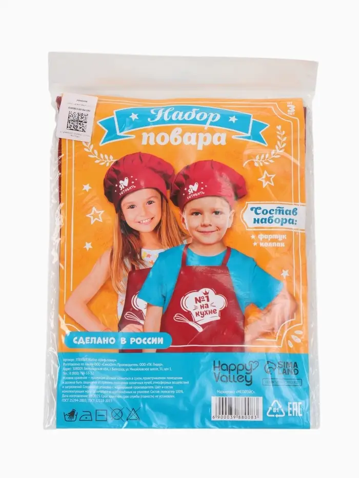 Игра в повара учит ребёнка общаться и фантазировать. Фартук используют на творческих занятиях с сухими материалами — он защитит одежду во время лепки или рисования. Набор подходит мальчикам и девочкам от 3 лет.