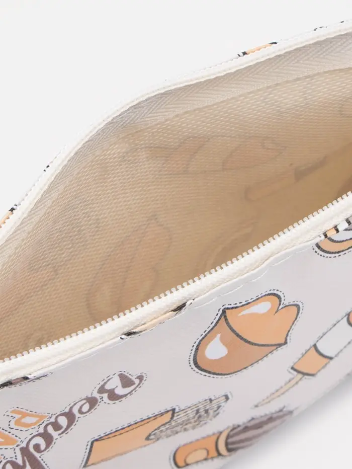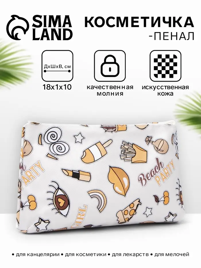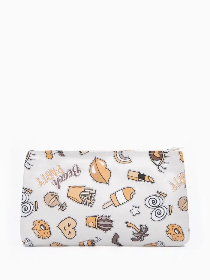 Косметичка - пенал на молнии, плоская, маленькая, с принтом, белая=