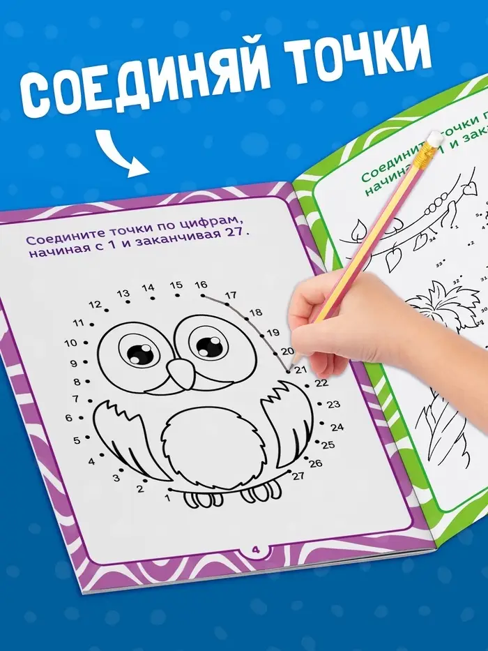 Листайте страницы книги и внимательно читайте задания. Готовьте карандаши, соединяйте точки, и у вас получится цельная картинка, которую можно раскрасить. Только будьте внимательны, сложность заданий повышается почти с каждой страницей книги.