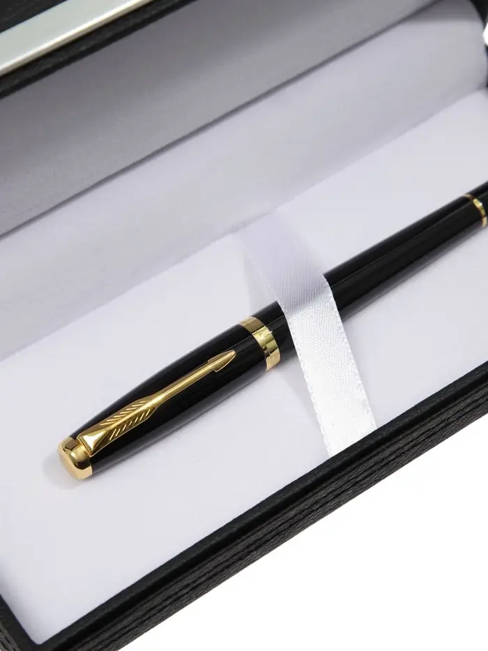 Эта перьевая ручка в кожаном футляре создана для церемоний и важных подписей. Её металлический корпус и перо толщиной 0,7 мм подходят для официальных документов и каллиграфической практики. Вы ощущаете вес инструмента в руке, а зона хвата обеспечивает точный контроль над каждым движением.