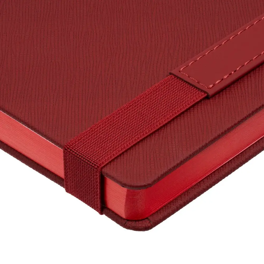 Ежедневник с твердой обложкой, выполнен из материала Nice Touch, красный РР, дополнен резинкой с лейблом из материала Soft Touch и ляссе в цвет обложки.