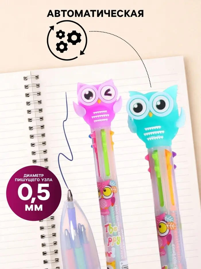 Ручка шариковая «Совы», автоматическая, 6-цветная, корпус с рисунком