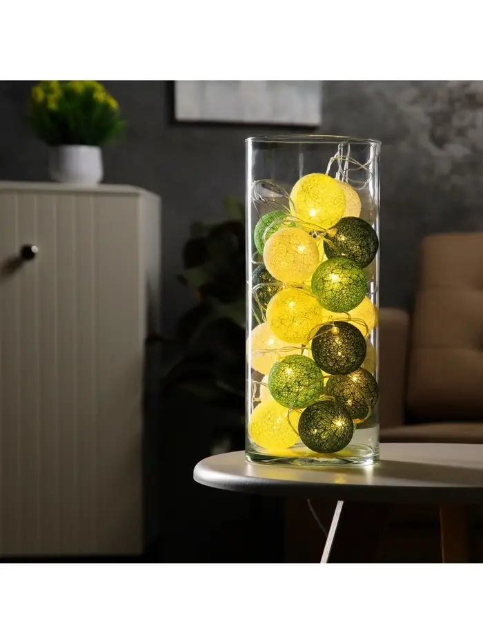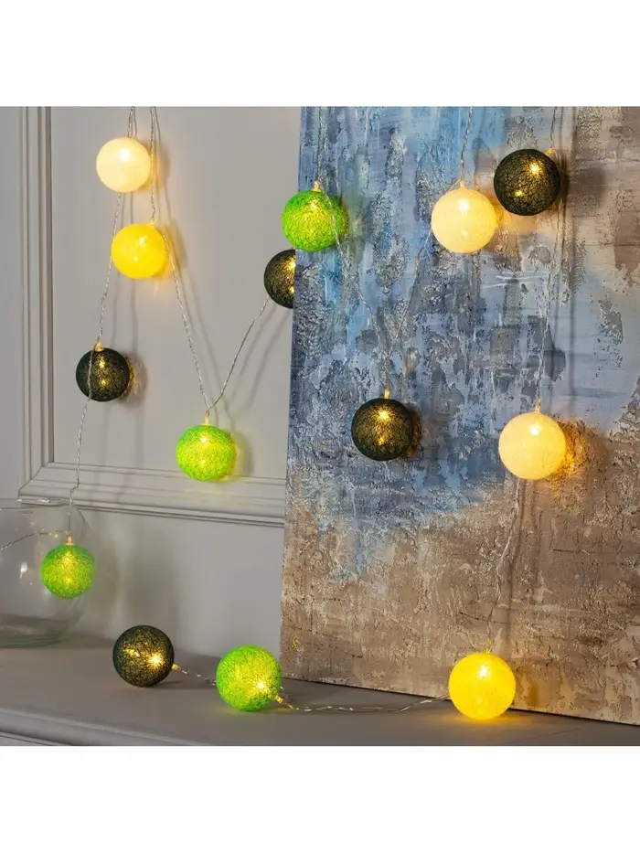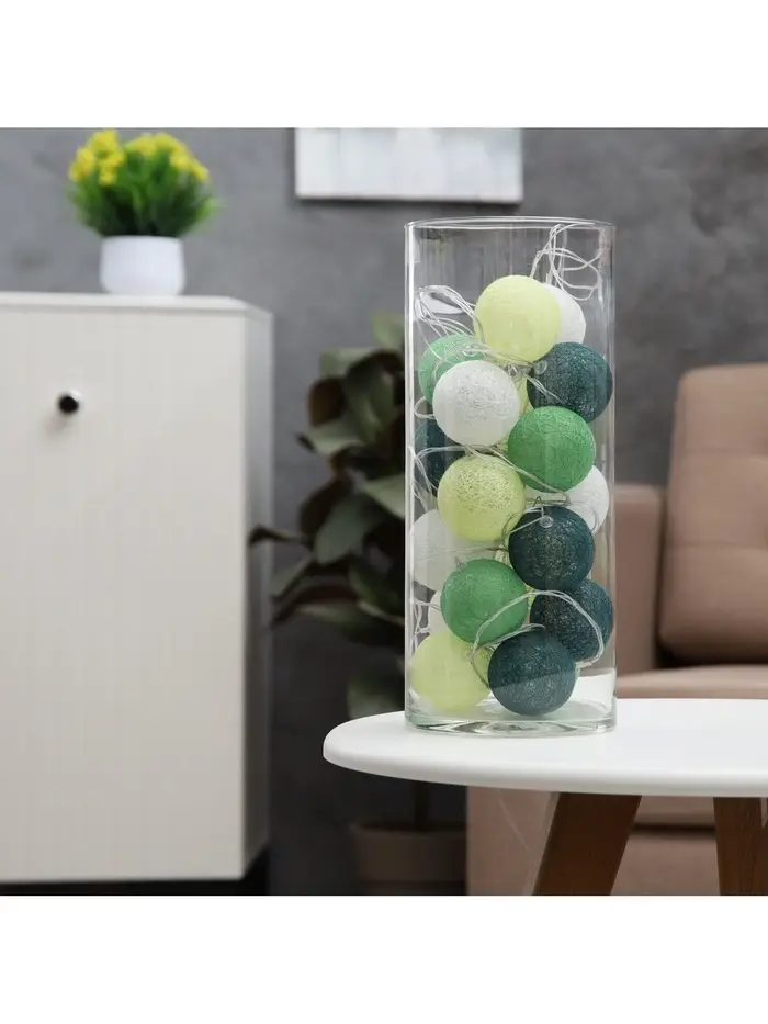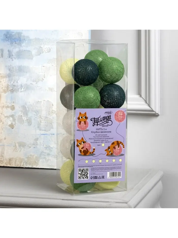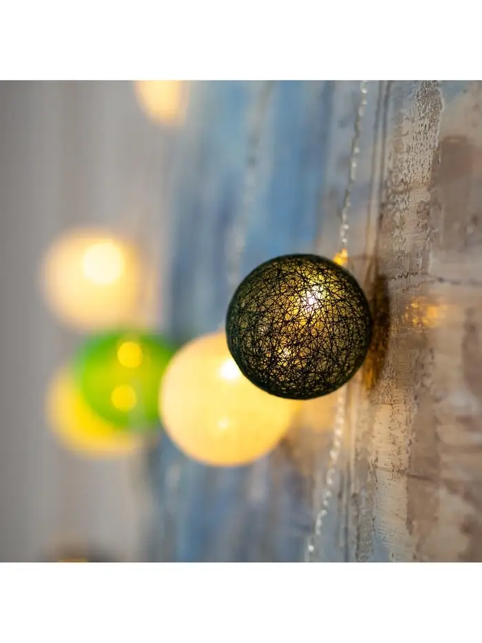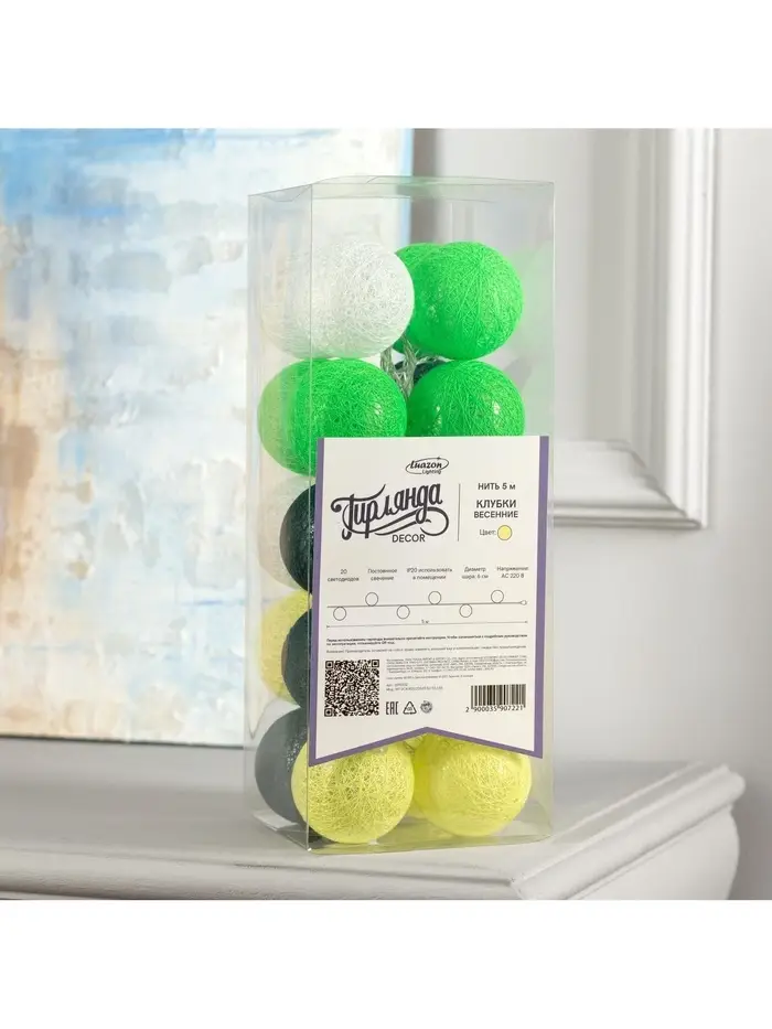 Гирлянда «Нить» 5 м с насадками «Клубки бело-зелёные», IP20, прозрачная нить, 20 LED, свечение тёплое белое, 220 В