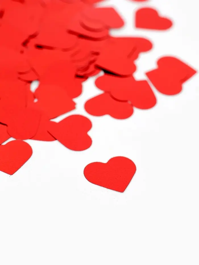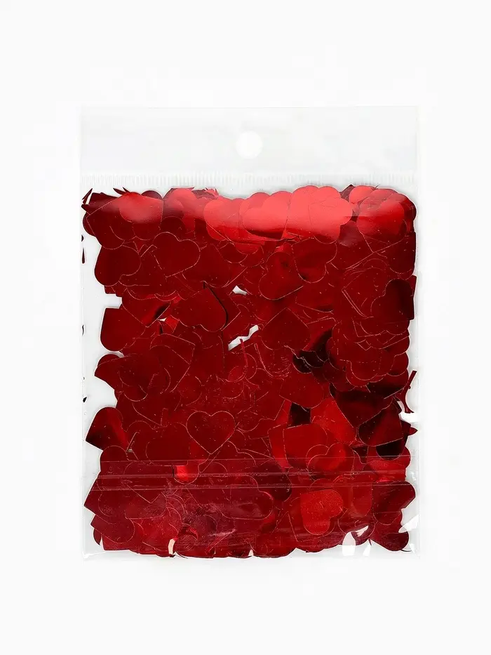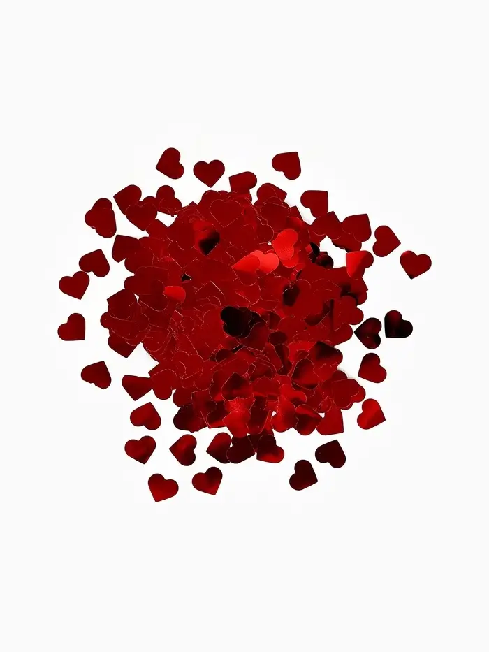 Красное металлическое конфетти в форме сердец — как ”рассыпанные отблески заката на поверхности тёплого мёда с лепестками розы“. Это не просто смесь оттенков — это единый, благородный тон: с глубиной, нежностью и лёгким подтоном, который проявляется при боковом свете. Форма сердца остаётся узнаваемой, но не буквальной — каждый элемент звучит как тихое признание, а не громкое заявление. Подходит для событий, где важна утончённая эмоциональность.