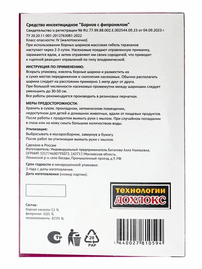 При использовании борных шариков «Дохлокс» массовая гибель тараканов наступает через 5‒7 суток. Насекомые поедают приманку, заражаются ядом, а затем отравляют им своих сородичей, что приводит к цепной реакции по типу эпидемической.Инструкция по применению: Вскрыть упаковку, извлечь борные шарики и разместить их в сухих точках скопления и передвижения тараканов. Располагать их следует на расстоянии примерно 1 м друг от друга. При большой численности насекомых промежутки следует уменьшить до 30‒50 см. Все работы рекомендуется производить в резиновых перчатках.Меры предосторожности: Хранить в сухом, прохладном, затемнённом помещении, недоступном для детей и домашних животных, вдали от пищевых продуктов. После работы со средством вымыть руки с мылом. При попадании в глаза или на кожу смыть большим количеством воды.Утилизация: Выбрасывать в мусоросборник, завернув в бумагу. После работ по утилизации вымыть руки с мылом.Состав: борная кислота (15 %), фипронил (0,065 %), техкомпоненты (84,935 %).