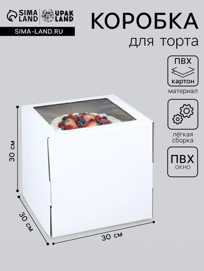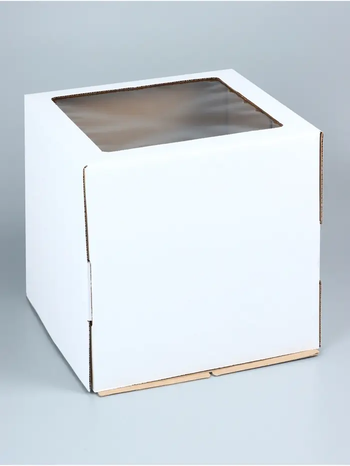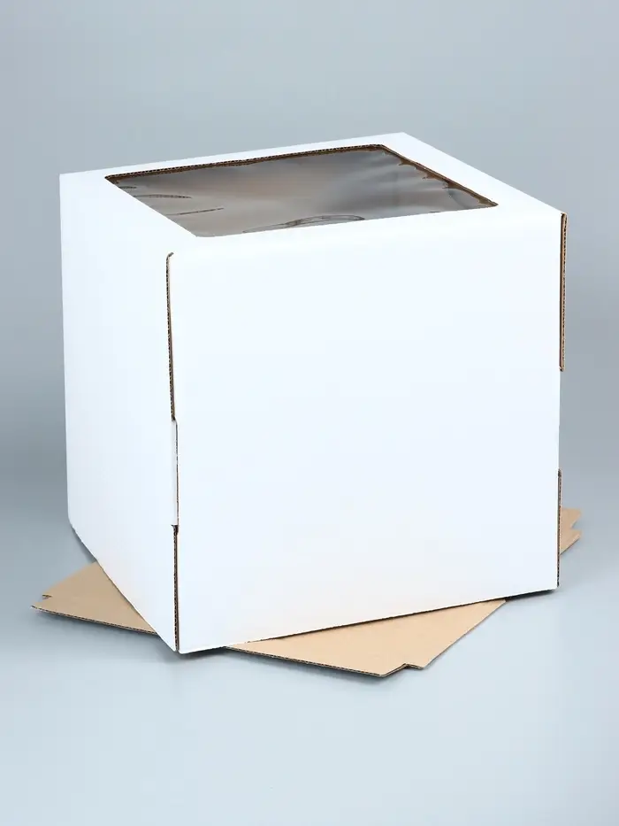 Вместительная упаковка для высоких тортов и десертов. Белая коробка для торта с окном, 30×30×30 см — это увеличенная версия классической упаковки, созданная специально для высоких, многоярусных десертов или объёмных кондитерских композиций. Её кубическая форма обеспечивает максимальную защиту и презентабельность.