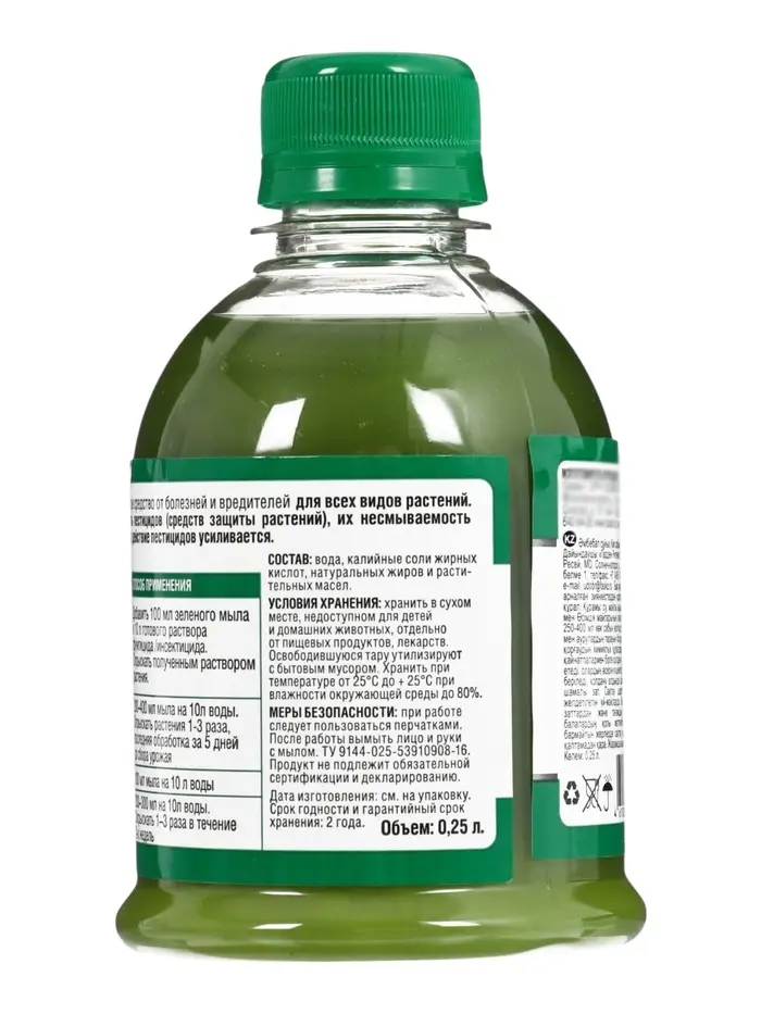 Универсальное, безопасное биологическое средство для защиты растений от болезней и вредителей, полученное из натуральных жиров и растительных масел. Экологически чистый продукт.