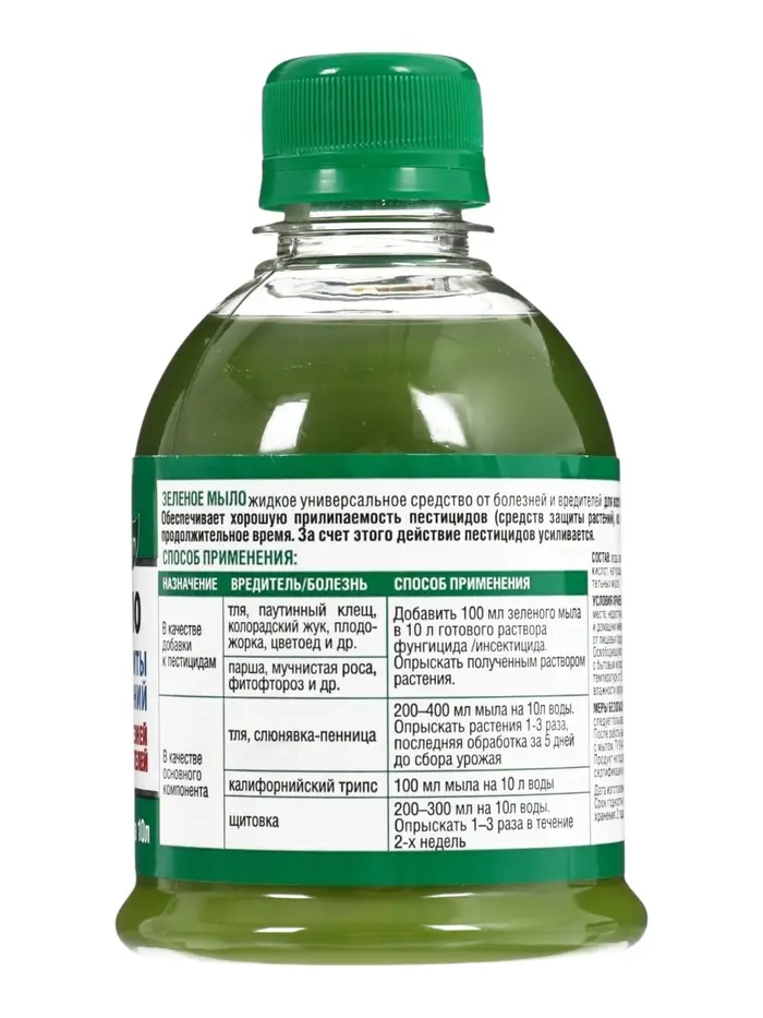 Настоями и отварами: добавка к настоям и отварам растений, а также к табачному настою от вредителей и болезней. Из расчета 40-100 мл зеленого мыла на 10 л настоя (отвара). Зеленое мыло обеспечивает хорошую прилипаемость пестицидов, их несмываемость продолжительное время. За счет этого действие пестицидов усиливается.