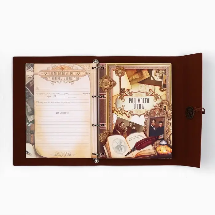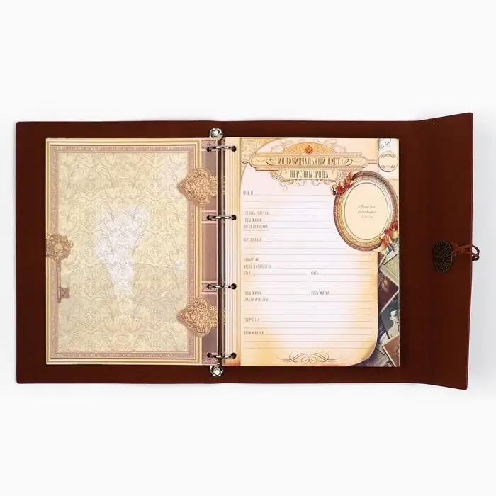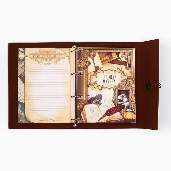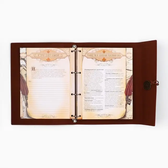 Родословная книга на кольцах в переплёте из кожзама содержит 65 листов, лист генеалогического древа формата А2 и лист наклеек для него. Листы состоят из мелованного картона плотностью 250 гр.