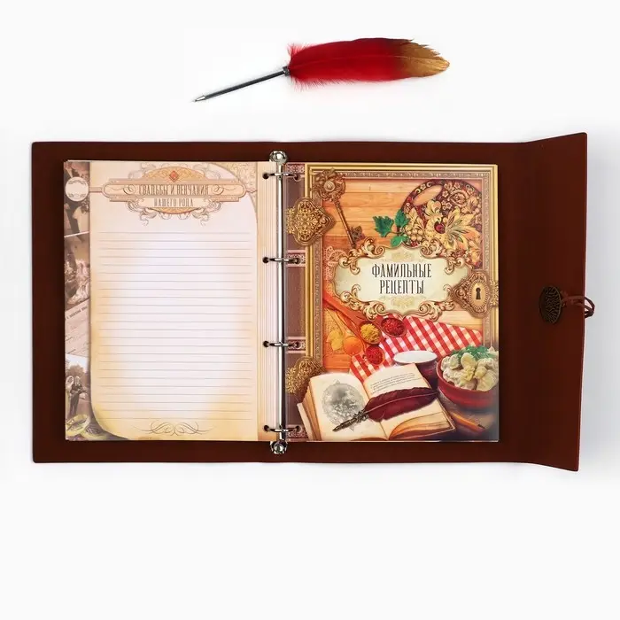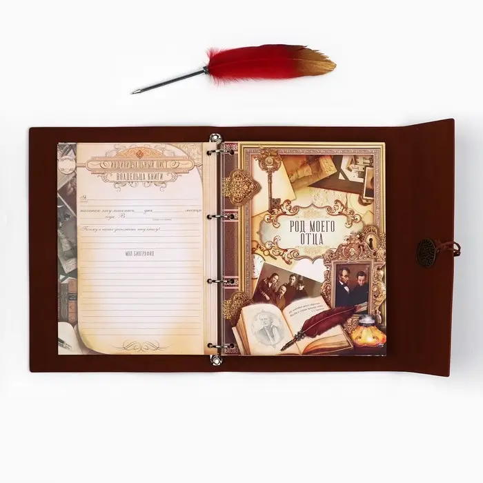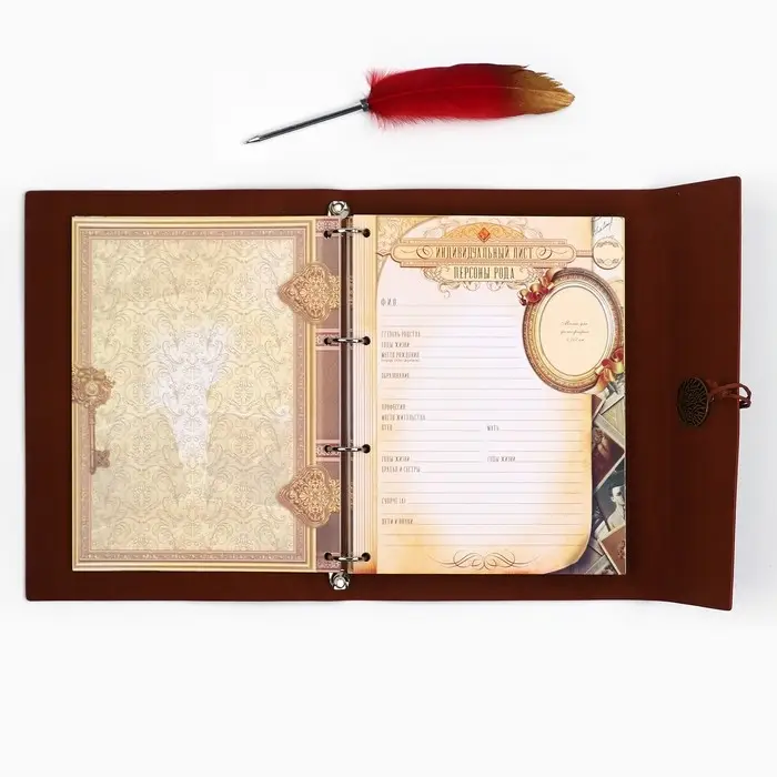 Родословная книга на кольцах в переплёте из кожзама содержит 65 листов, лист генеалогического древа формата А2 и лист наклеек для него. Листы состоят из мелованного картона плотностью 250 гр.