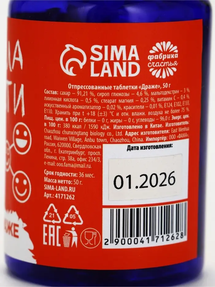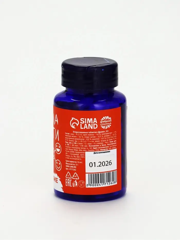 Состав: сахар 91,21%, сироп глюкозы 4,6%, мальтодекстрин 3%, лимонная кислота 0,5%, стеарат магния 0,25%, витамин С 0,4%, искусственный ароматизатор 0,02%, красители 0,01%, Е124, Е102, Е133, Е110.