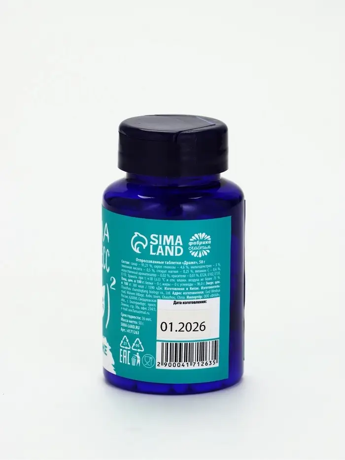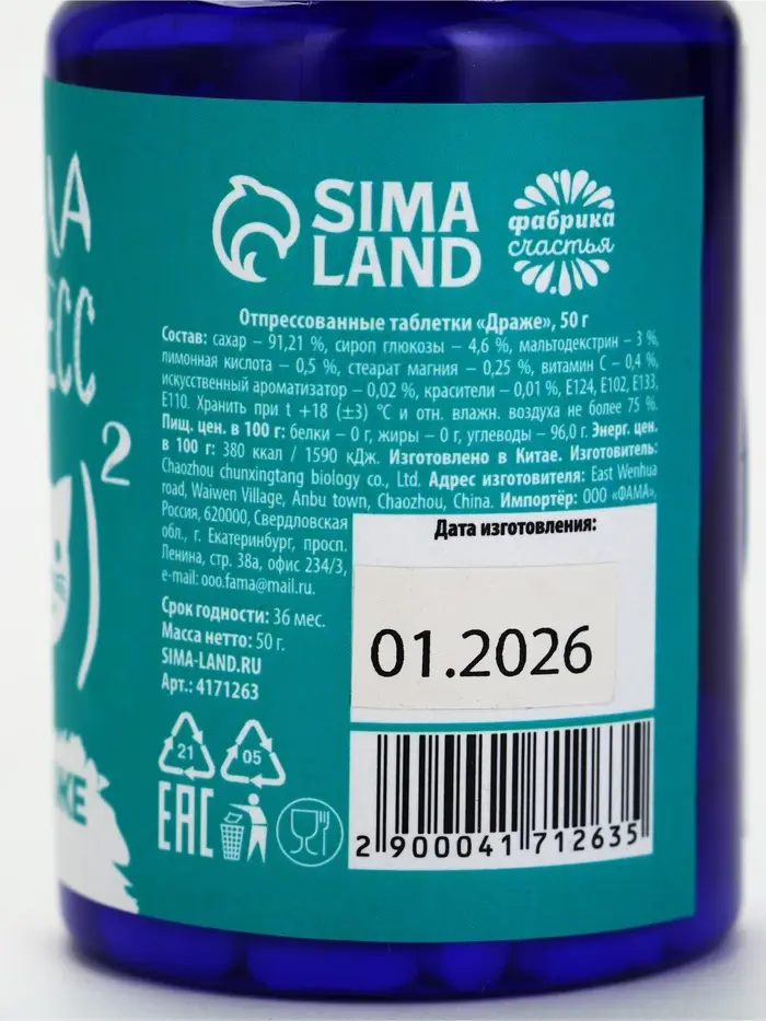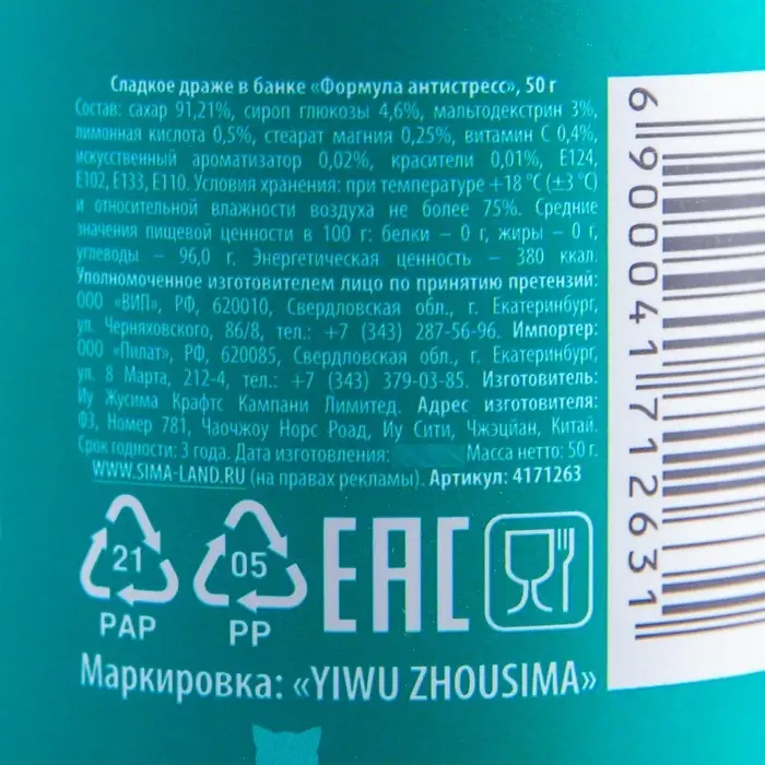 Состав: сахар 91,21%, сироп глюкозы 4,6%, мальтодекстрин 3%, лимонная кислота 0,5%, стеарат магния 0,25%, витамин С 0,4%, искусственный ароматизатор 0,02%, красители 0,01%, Е124, Е102, Е133, Е110.