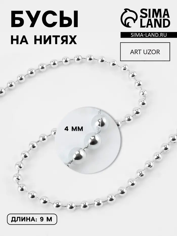 Бусы на нитях, 4 мм, 9±1 м, цвет серебряный