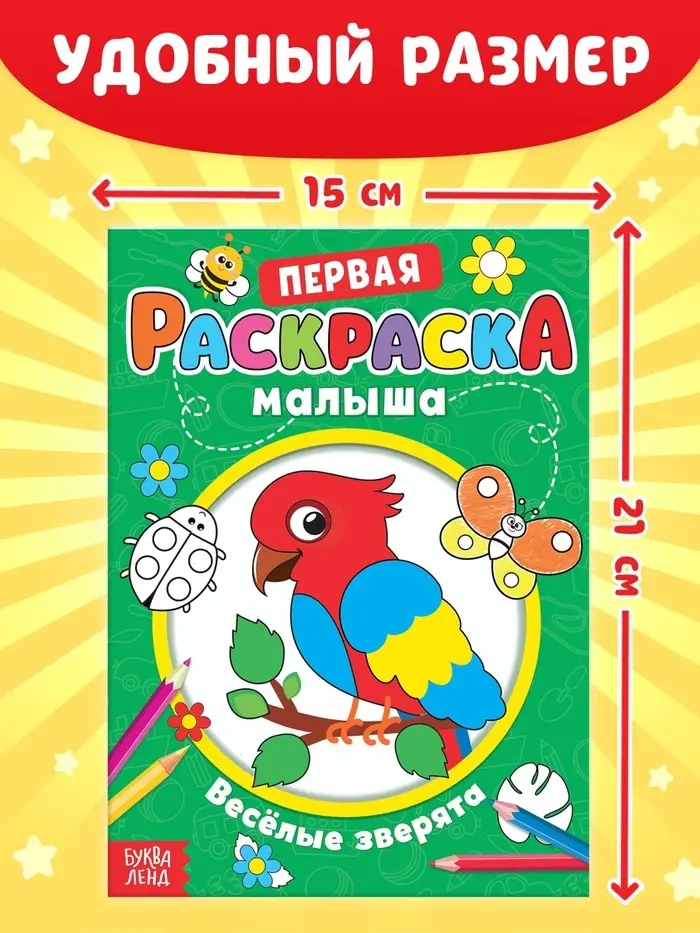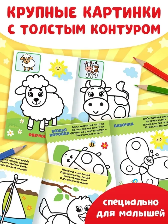 - Раскраски адаптированы для малышей: все элементы крупные, картинки простые и понятные.