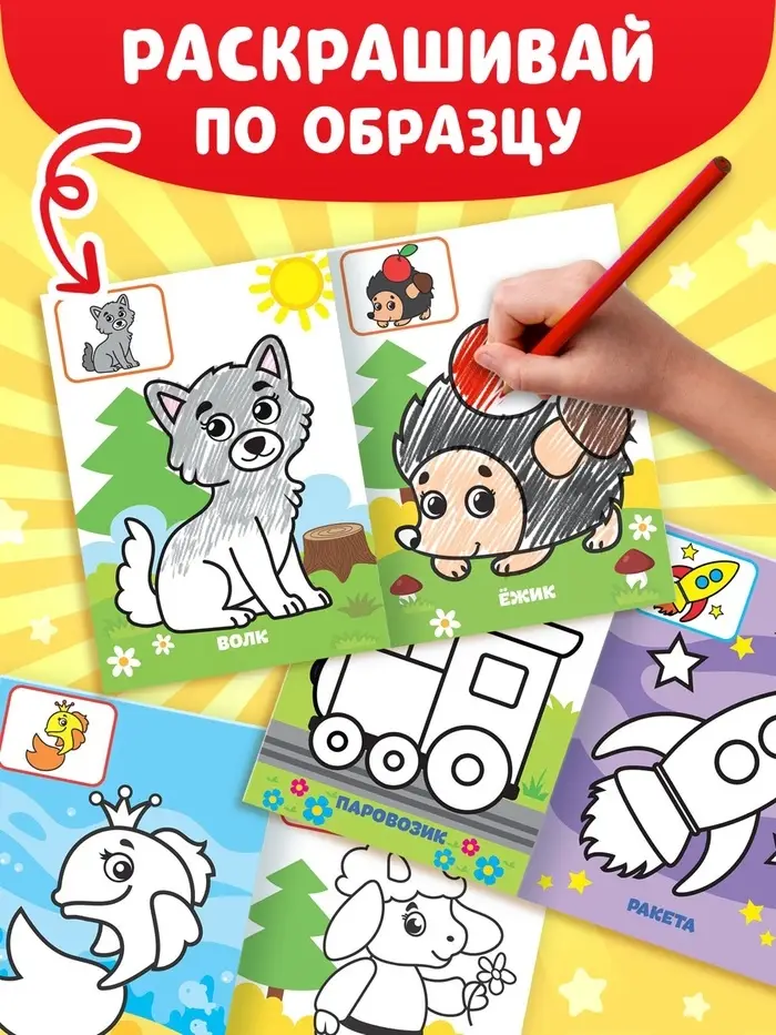 Набор раскрасок из серии «Раскрась по образцу» разработан специально для малышей, которые только делают первые шаги в этом виде творчества.