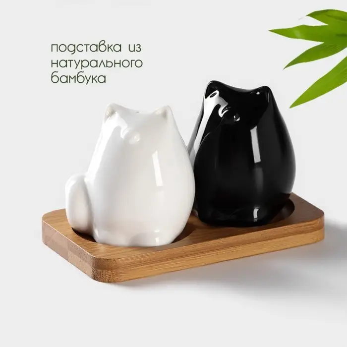 Набор фарфоровый для специй на бамбуковой подставке BellaTenero «Котики», 3 предмета: солонка, перечница, подставка, белый, чёрный