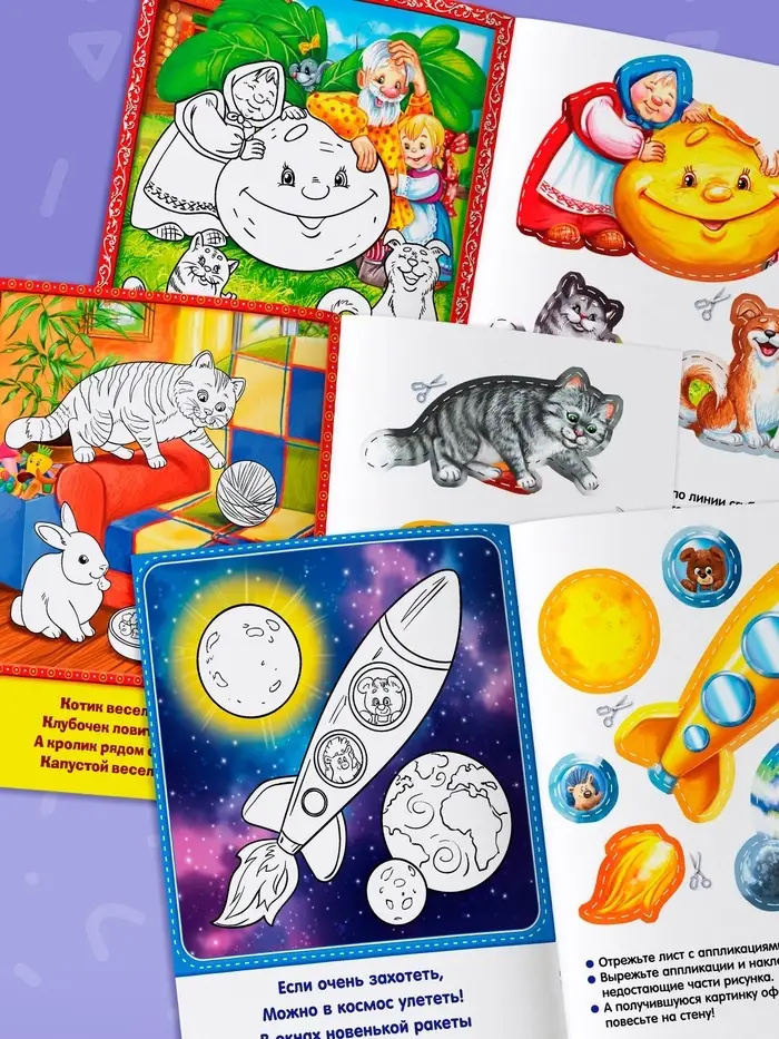 Перед вами книги-аппликации, предназначенные для детей от 2 лет. Читайте увлекательные истории и стихотворения, вырезайте изображения и наклеивайте их на картинки. Знакомьтесь с цветами, геометрическими фигурами и развивайте пространственное мышление в лёгкой игровой форме!