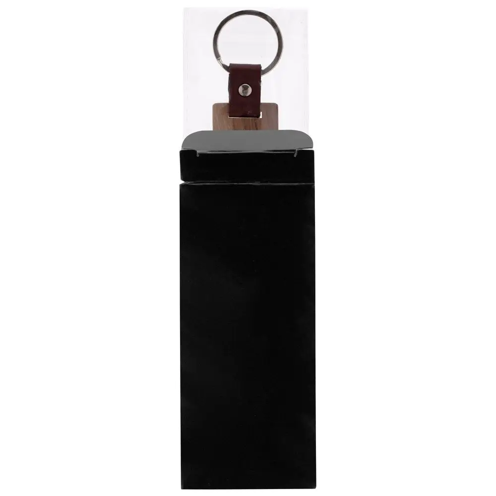 Прямоугольная пластина из ароматного красного дерева сапеле, которая крепится к кольцу хлястиком из искусственной кожи, — лаконичное и практичное решение в природном стиле.
